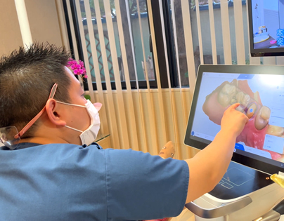CAD/CAMシステム「セレックシステム」はお口の中を立体撮影が可能な小型のビデオカメラ(光学印象採得カメラ)で撮影します。