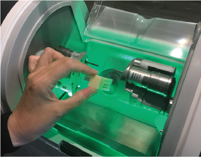 詰め物・被せ物の製作には、安定した物体の材料(マシナブル・マテリアル)を使用しデザイン通りに加工機が高速で削り出します。